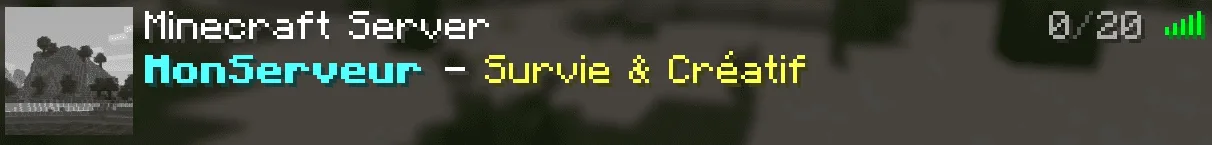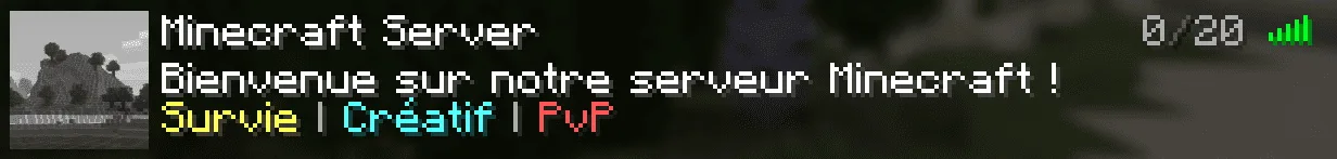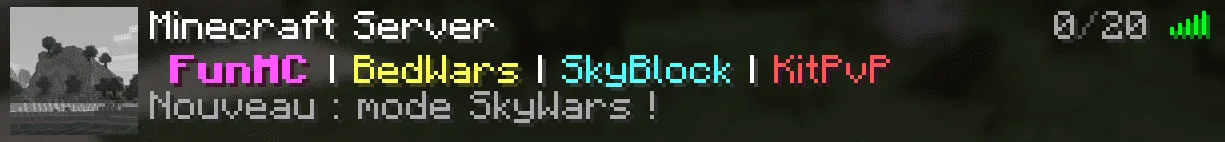 Wenn ein Spieler mit der Maus über den Spielerzähler (zum Beispiel "3/20") fährt, wird ein zusätzlicher Text angezeigt. Standardmäßig ist dies die Liste der verbundenen Spieler. Mit einem Plugin wie MiniMOTD oder ServerListPlus können Sie diesen Text durch eine personalisierte Nachricht ersetzen: Serverregeln, Discord-Link, Event-Ankündigung usw.