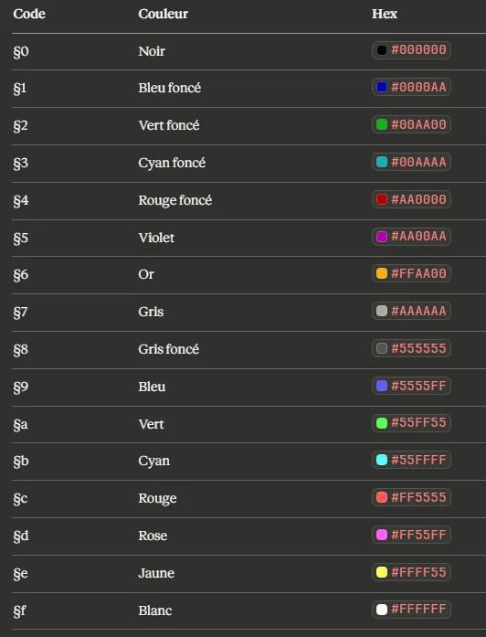 Minecraft uses the symbol § followed by a character to apply a color or formatting effect. Here is the complete reference of Minecraft color codes.