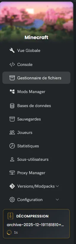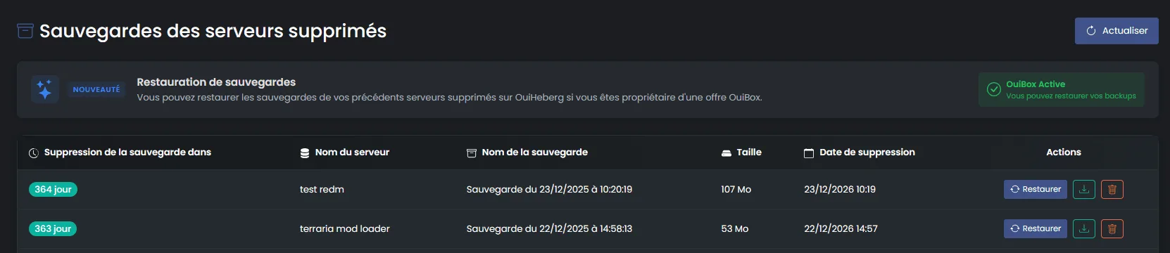Si vous disposez d'une offre OuiBox active, vous avez désormais la possibilité de restaurer cette sauvegarde à l'identique, directement depuis votre panel. La restauration permet de retrouver exactement l'état du serveur au moment de la sauvegarde, sans perte de données ni manipulation complexe.
