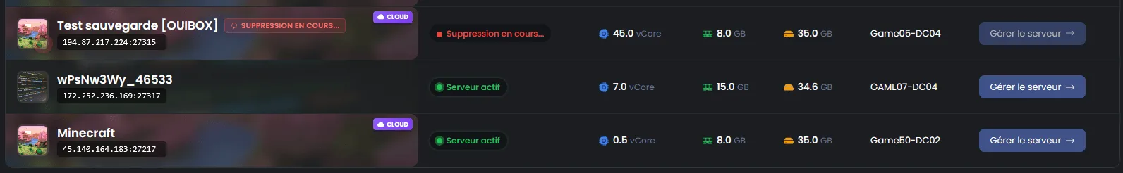 Lorsqu'un serveur est supprimé, une sauvegarde complète est automatiquement conservée par nos systèmes, incluant l'ensemble des données, fichiers et configurations associées.